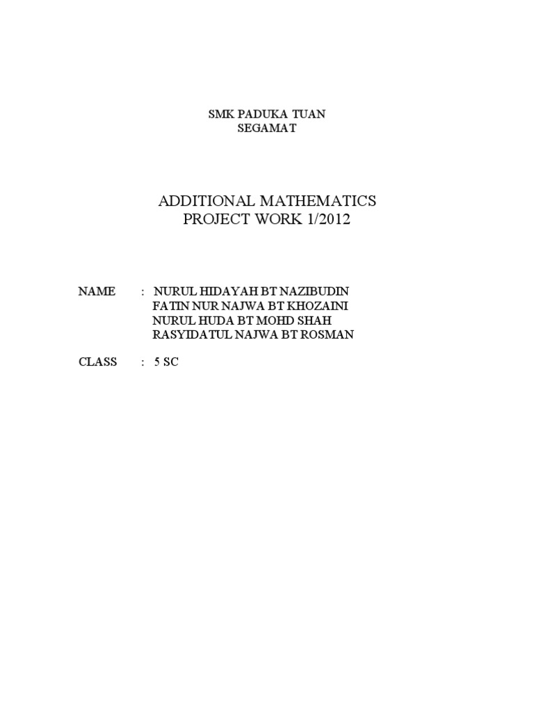 Mac 2019 hasil pembelajaran kursus: Jawapan kerja kursus add math tugasan 1? Sample add math project work for selangor included at the bottom of this post. Kertas 3 prinsip perakaunan 3756/3. ➤ essay on kerja kursus addmath ✍ not forgotten my parent's for providing everything, such as money, to buy anything that are related to this project work and their advise, purport which.