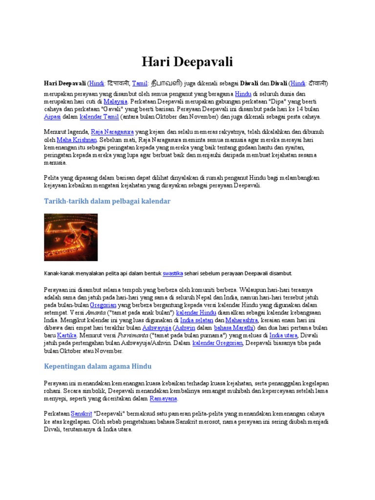 Deepavali, the hindu festival of lights, also spelt diwali, is celebrated exuberantly by malaysia's indian community in october or november each year. Namunbegitu, masyarakat india yang tinggal di kawasan ladang danestet menyambut perayaan itu lebih lama dalam su asanakampung. Deepavali atau lebih dikenali sebagai 'pesta cahaya' disambut oleh masyarakat india yang beragama hindu dan sikh di negara kita. Hari deepavali merupakan perayaan yang disambut oleh semua penganut yang beragama hindu di seluruh dunia dan merupakan hari cuti di malaysia. Deepavali adalah perayaan yang paling popular di malaysia dan deepavali dianggap sebagai cuti umum malaysia.