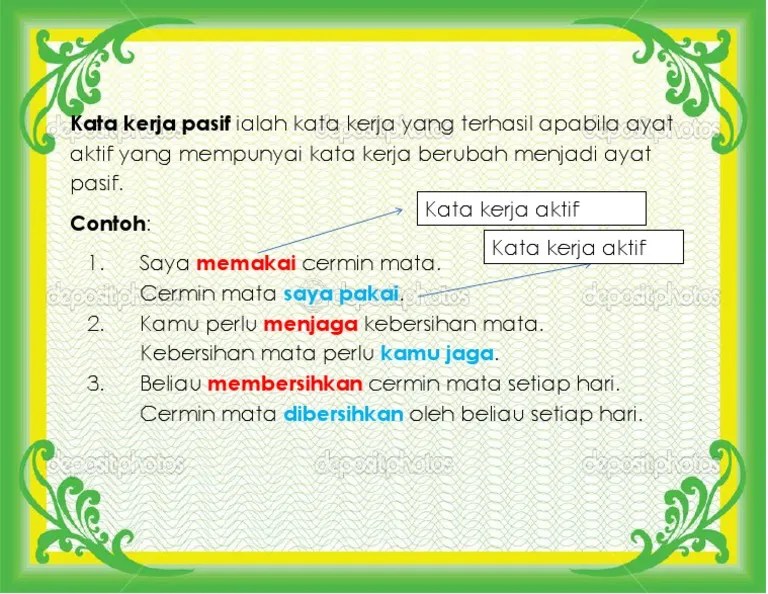 Tahun 1 bahasa melayu tatabahasa kata kerja pasif. Pembentukan kata kerja dan penggunaan kalimat pasif sebagai berikut di bawah. Kata kerja aktif transitif dan kata kerja pasif dalam subjek bahasa melayu tahun 5. Kata kerja pasif adalah kebalikan dari kata kerja aktif, yaitu kata kerja yang siapa yang dibicarakan (subjek) menjadi pengalam atau yang mengalami. Video pendidikan untuk p&p tahun 4.^^ Kata kerja pasif # kata kerja yang kita bahas pada dars sebelumnya adalah kata kerja aktif (مبني للمعلوم). Start studying kata kerja pasif. Layari dan langgan modul pembelajaran lengkap myguru di #purchasemyguru видео tahun 4 | bahasa melayu myguru merupakan portal pembelajaran yang dibina selaras dengan keperluan silibus pelajar tahun 1 hingga tingkatan 5. Dimarahi, dinasihati, di pukuli, terlempar. Kata kerja yang digunakan dalam kalimat pasif mengalami perubahan bentuk. Kata kerja pasif umumnya dapat dilihat dari ciri ciri adanya awalan di contoh kata kerja pasif : Kata kerja pasif (tahun 4). Contohnya, kubaca, kausenangi, anda jelaskan, kaubaca, kita masukkan, kaumasukkan, kami perindah, saya percayai, awak percayai, kita perlihatkan.