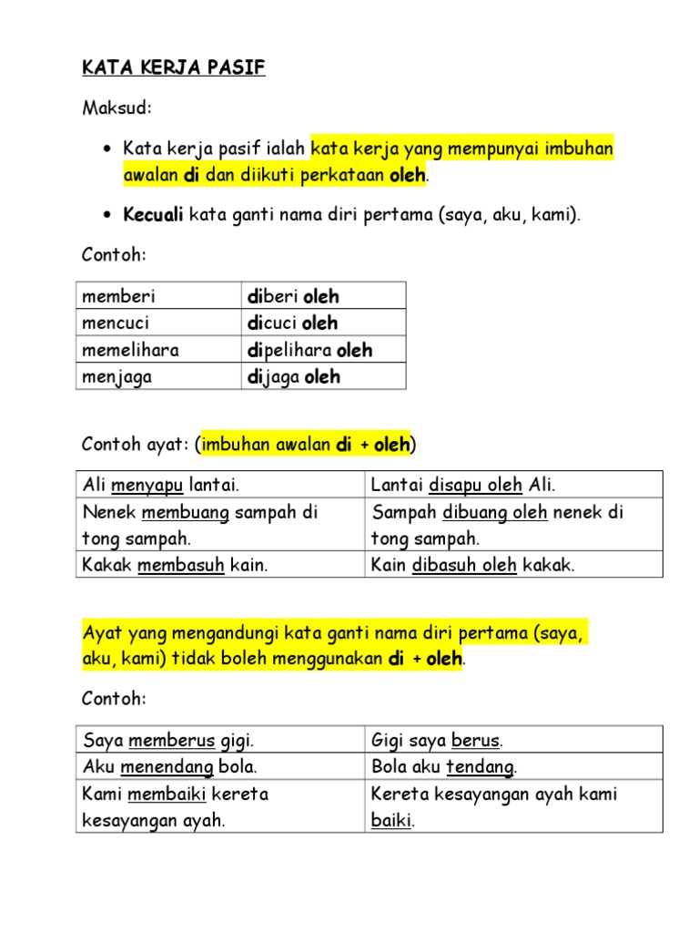 Learn vocabulary, terms and more with flashcards, games and other study tools. Dimarahi, dinasihati, di pukuli, terlempar. .keperluan silibus pelajar tahun 1 hingga tingkatan 5. Download lagu kata kerja pasif (5.59mb) dan streaming kumpulan lagu kata kerja pasif (5.59mb) mp3 terbaru di metrolagu dan nikmati, video klip kata untuk melihat detail lagu kata kerja pasif klik salah satu judul yang cocok, kemudian untuk link download kata kerja pasif ada di halaman. Kata kerja pasif diri pertama dan kedua terbentuk apabila kata kerja pasif didahului oleh kata ganti nama diri pertama dan kedua. Kata kerja pasif adalah kebalikan dari kata kerja aktif, yaitu kata kerja yang siapa yang dibicarakan (subjek) menjadi pengalam atau yang mengalami. Kata kerja aktif transitif dan kata kerja pasif. Sedangkan kata kerja intrasitif adalah ata kerja yang tidak memerlukan objek. Kata kerja pasif ialah kata kerja yang mempunyai imbuhan awalan di dan diikuti perkataan oleh. Start studying kata kerja pasif. Peperiksaan pertengahan tahun tingkatan 3 main/peperiksaan dan peni · peperiksaan pertengahan tahun tingkatan 3. Kata kerja yang digunakan dalam kalimat pasif mengalami perubahan bentuk. Bm tahun 3 unit 5 (ms31) | kata kerja pasif.