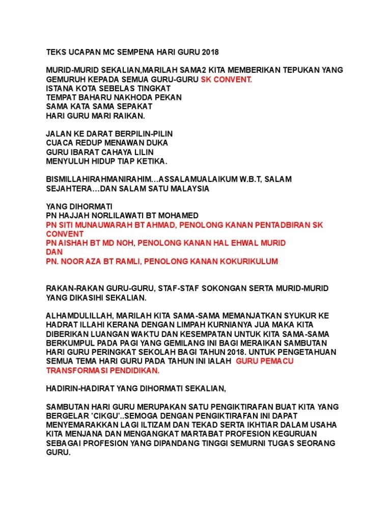 Menitikberatkan peranan guru dalam pembinaan kebangsaan (termasuk perpaduan dan integrasi), pembangunan negara dan perkhidmatan kepada masyarakat. Berguru demi ilmu, bina generasi baharu. 0 ratings0% found this document useful (0 votes). Tuan anas bin ayob ketua penolong pengarah bpi jais tarikh : Program sambutan hari guru 2019 pages 1 5 text version anyflip.